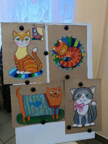 Ольга Михайловна пошагово показала, как с помощью простых линий и форм создать милый образ пушистого друга. Участники с увлечением взялись за масляные художественные мелки: кто‑то старался точно повторить образец, а кто‑то добавлял своим котам забавные детали.