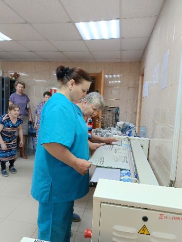 После этого экскурсанты увидели сушильную машину, понаблюдали за работой и посмотрели, как выгружают почти сухое бельё.Финальной частью стала гладильная комната. Пожилым людям показали катки для глажки постельного белья.Некоторые гости даже попробовали сами погладить простыню, наволочку под присмотром сотрудника.Проживающие остались довольны: они по‑новому взглянули на работу прачечной и поблагодарили сотрудников за труд.